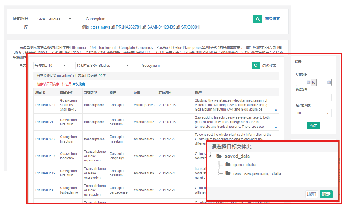 2)搜集SRA數據庫中,棉屬轉錄組數據,共搜集得到154個來源于illumina平臺的棉屬轉錄組數據。BMKCloud公共數據模塊數據搜集過程:進入平臺公共數據模塊,輸入關鍵詞“Gossypium”,并按SRA項目編號進行檢索,使用數據類型“transcriptome”進行過濾,最終得到104個項目數據,可根據數據來源平臺在進行進一步手動過濾,最后一鍵保存數據至用戶賬號用于后續分析