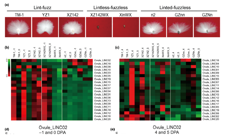 2)結果發現,編號為LINC02在開花期0天左右轉錄水平在lint纖維正常發育株中顯著高于lint纖維缺失株;在開花期5天左右轉錄水平fuzz纖維正常發育株中顯著高于fuzz纖維缺失株;而上述兩個時間點分別為兩種棉纖維起始(initiation)時間點,因此,文章認為編號為LINC02的lncRNA與棉纖維的initiation有關