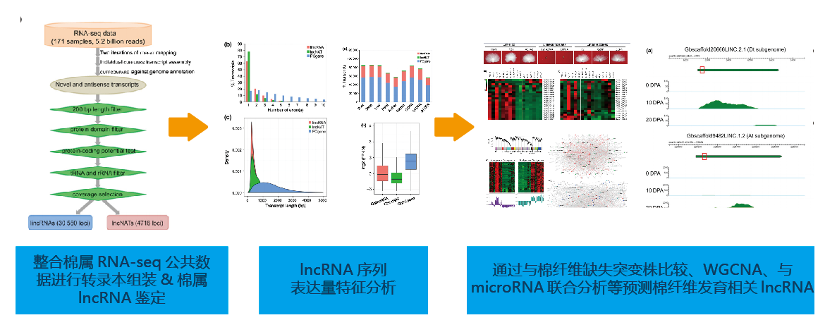 整合公共數據庫中棉屬RNA-seq數據,進行轉錄本重構(有參)并鑒定其中lncRNA,用于后續的棉纖維發育相關lncRNA分析