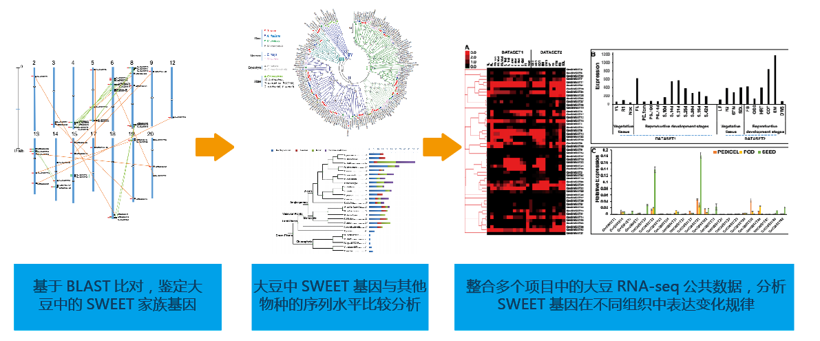 SWEET基因家族在植物體內的糖運輸、免疫及生殖組織發育過程中發揮著非常重要的作用。研究者使用擬南芥、水稻中的SWEET家族基因序列,通過BLAST比對,鑒定到了大豆中的52個SWEET基因。