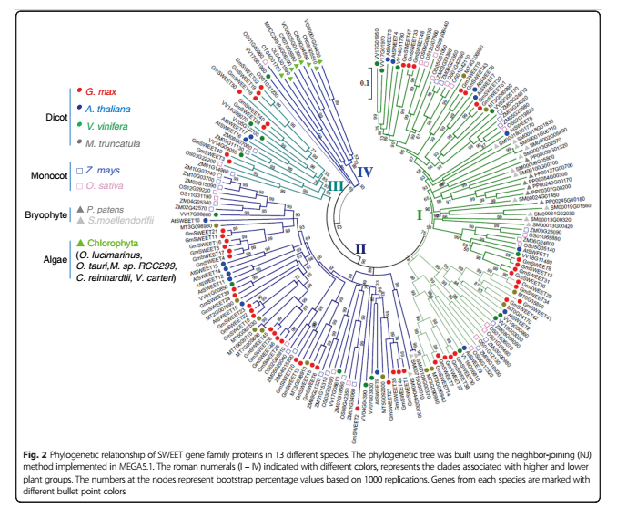 為了了解不同物種中SWEET家族基因的進化關系,研究者對大豆中的SWEET家族基因與其他13個物種(包括水稻、擬南芥、玉米在內)中的SWEET基因構建系統進化樹。