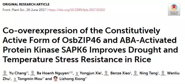 轉化基因:OsbZIP46CA1(bZIP轉錄因子OsbZIP46刪除負調控domainD)+ SAPK6(蛋白磷酸酶家族);