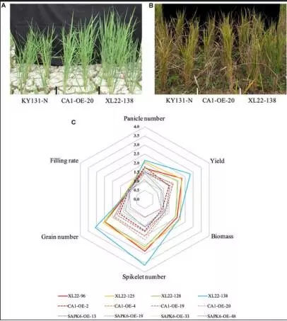 水稻轉基因材料:XL22(OsbZIP46CA1+SAPK6),CA1-OE(OsbZIP46CA1),SAPK6-OE(SAPK6)