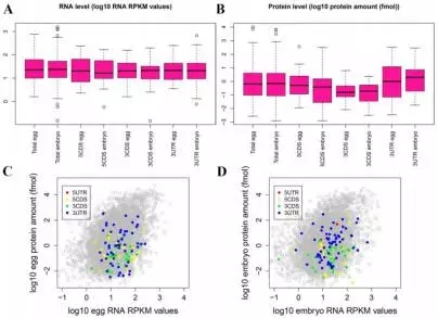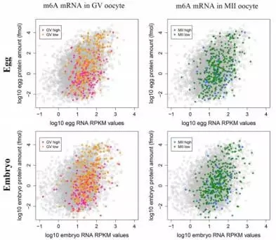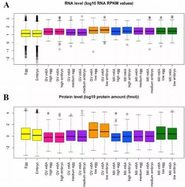 為了探索mRNAs甲基化是否與翻譯有關,作者把mRNA甲基化數據與Smits等人已發表的轉錄組和蛋白組數據進行了整合。通過BLAST分析,在RNA/蛋白數據中找到了723個m6A修飾mRNAs的信息。GV期或者MII期卵母細胞中高m6A峰的RNA水平(log10 RNA RPKM值)比總RNA高(在卵或者胚胎中),但是蛋白水平(log10 protein amount / fmol)比總蛋白水平低(Figure 2)。與高度甲基化的mRNAs相比,低甲基化RNAs顯示出非常高的表達水平(Figure 3)。這些結果說明在卵母細胞或早期胚胎中,m6A修飾可能與mRNA翻譯有關。