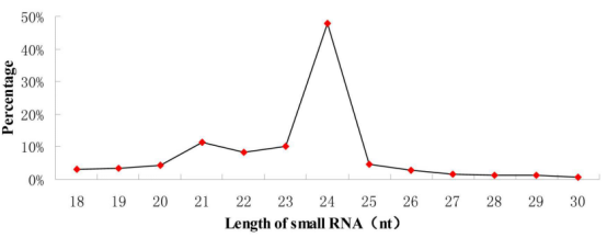 將沒有功能注釋的clean reads與miRBase(植物已知保守miRNA數據庫)進行比對,共獲得69個保守的miRNAs,分別屬于62個家族。根據長度分布發現,這些保守的miRNAs的長度主要集中在18-25nt之間,長度主要集中在24nt(46.385),其次是21nt。