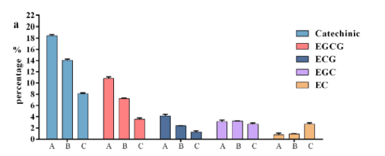 對茶樹1005葉片兒茶素含量的研究發現,兒茶素在不同葉片中的的含量由高到低排序為:第一葉,芽,第二葉,第三葉,成熟葉。第一葉,第三葉和成熟葉的兒茶素含量有顯著差異。