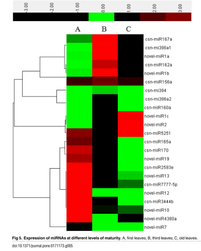 研究人員將這些新的miRNA與其他植物中已知的miRNA進行比對,揭示了許多同系物。除了三個miRNA歸為同一個家族外,絕大多數的miRNA可以被分為獨立的家族。研究者還對新miRNA的前體進行了分析,發現他們都有一個發卡環結構,長度在84-114bp。