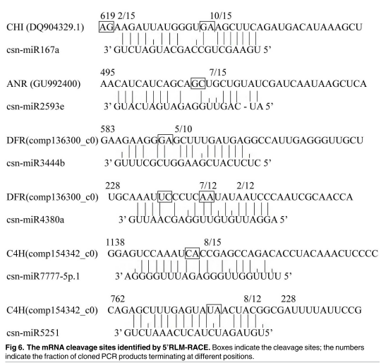 為了深入了解miRNA在調控兒茶素合成代謝中的功能,研究人員將高通量測序獲得的miRNA跟NCBI數據庫以及RNA測序的兒茶素生物合成相關基因的mRNA進行BLAST,預測可能的miRNA。為了消除假陽性,對預測的斷裂位點進行實驗驗證。通過5’-RLM-RACE實驗驗證了6個可能參與兒茶素生物合成功能基因表達調控的miRNA。它們分別是csn-miRNA167a、f csn-miR2593e、csn-miR4380a 、csn-miR3444b 、csn-miR5251 和csn-miR7777-5p.1。